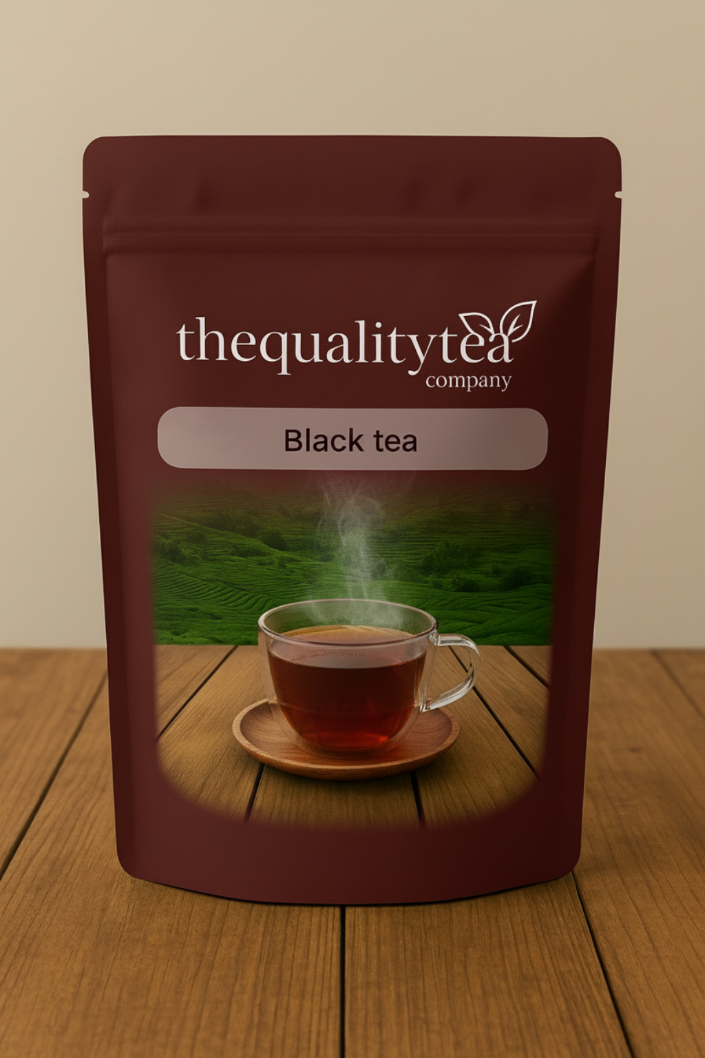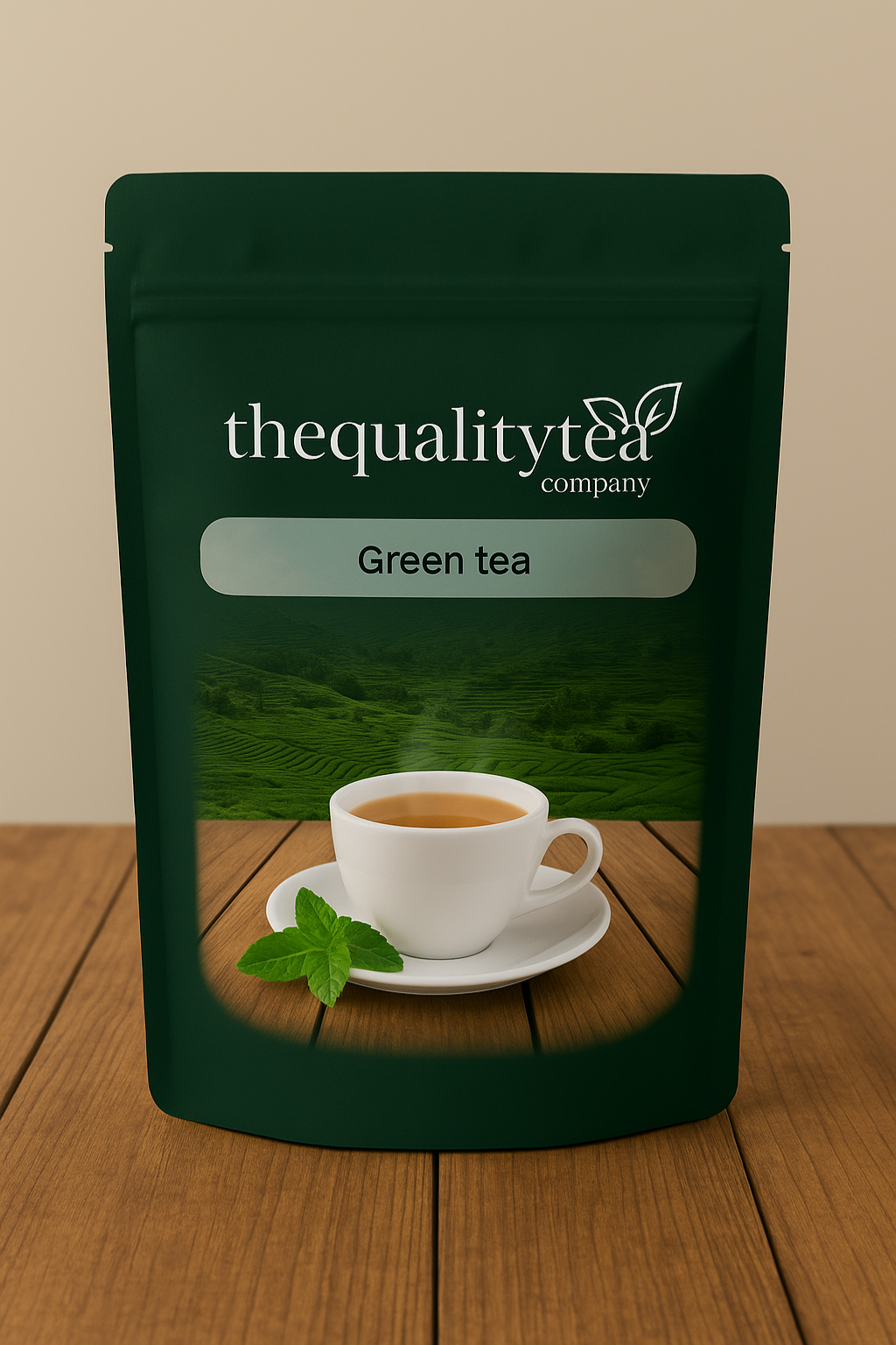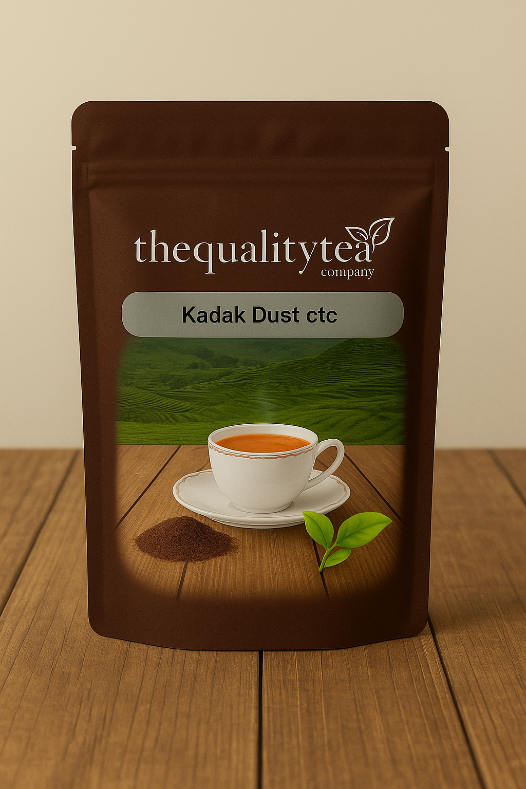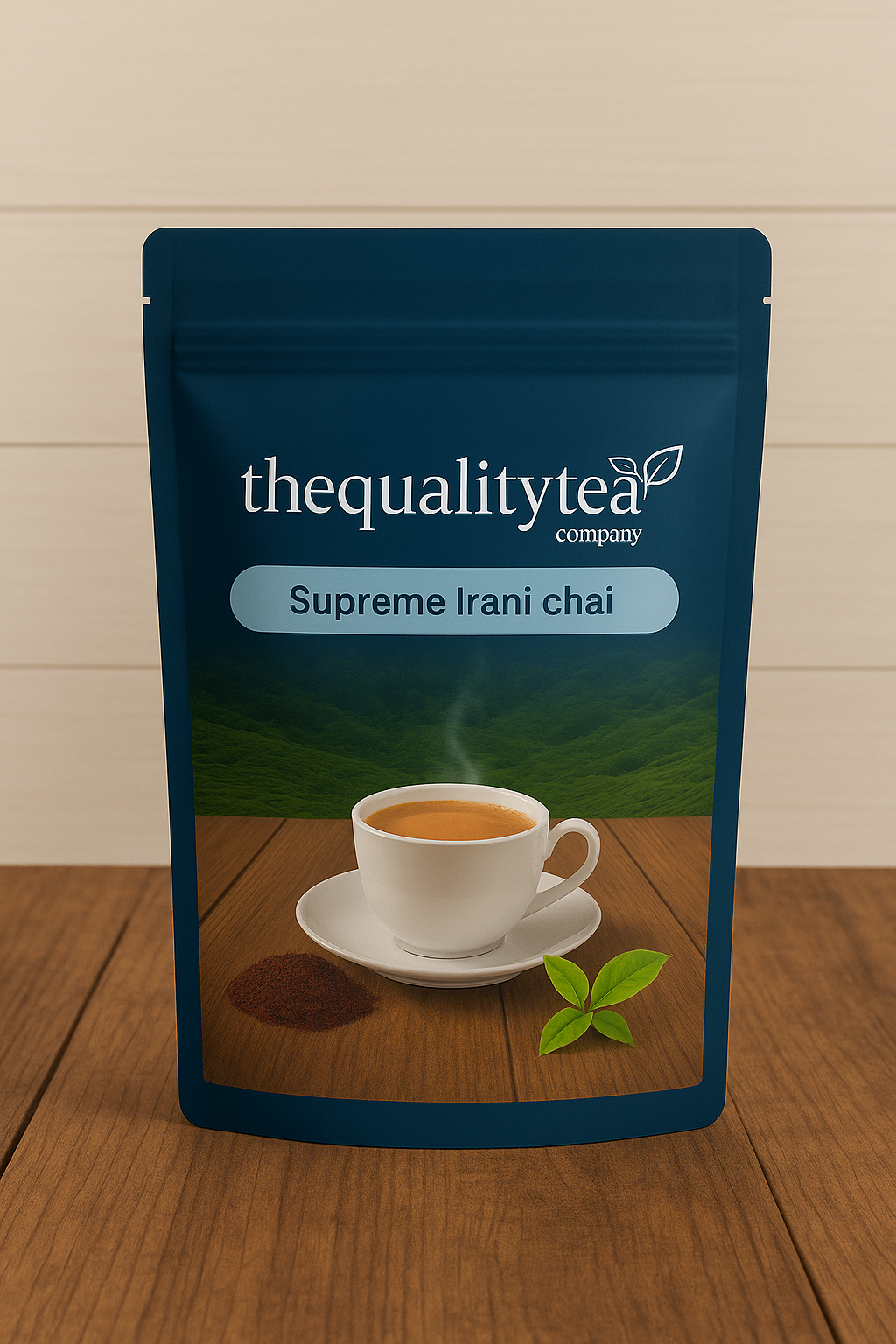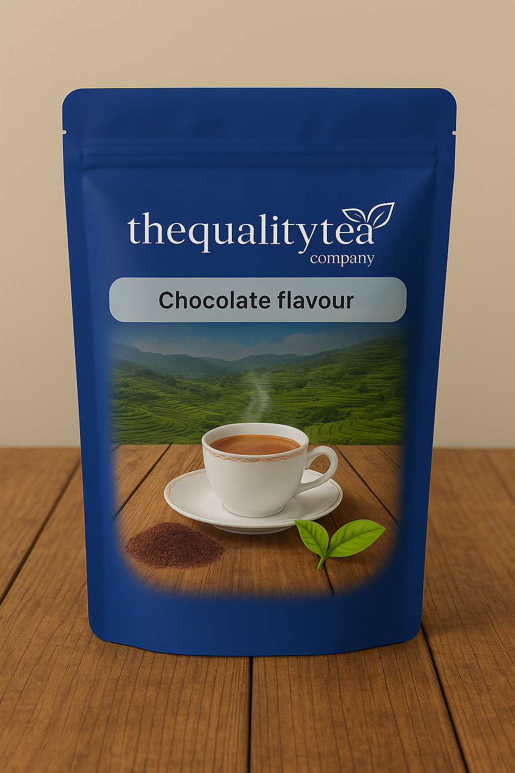 A green stand-up packet of The Quality Tea Company’s Product Premium Chocolate Mixture, featuring a steaming cup of tea in a white porcelain cup with matching plate, alongside tea powder and fresh tea leaves on a wooden surface
